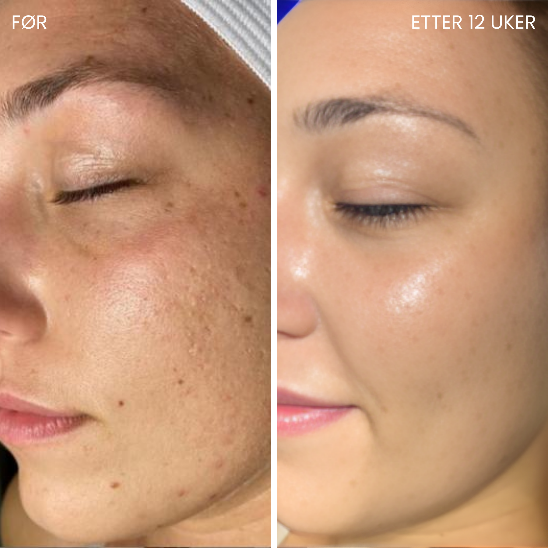 Lilla lys og NIR i kombinasjon har stimulert kollagenproduksjonen, løftet huden og gitt mer glød og utstråling. (Resultater kan ses etter 14–30 dager).